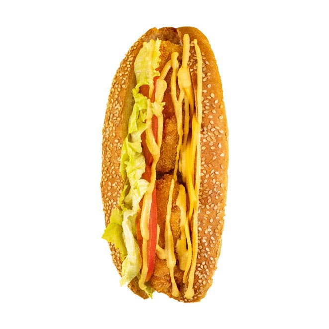 200 гр.Булка, куриное филе в панировке, салат Айсберг, сыр, томат, соус Фирменный